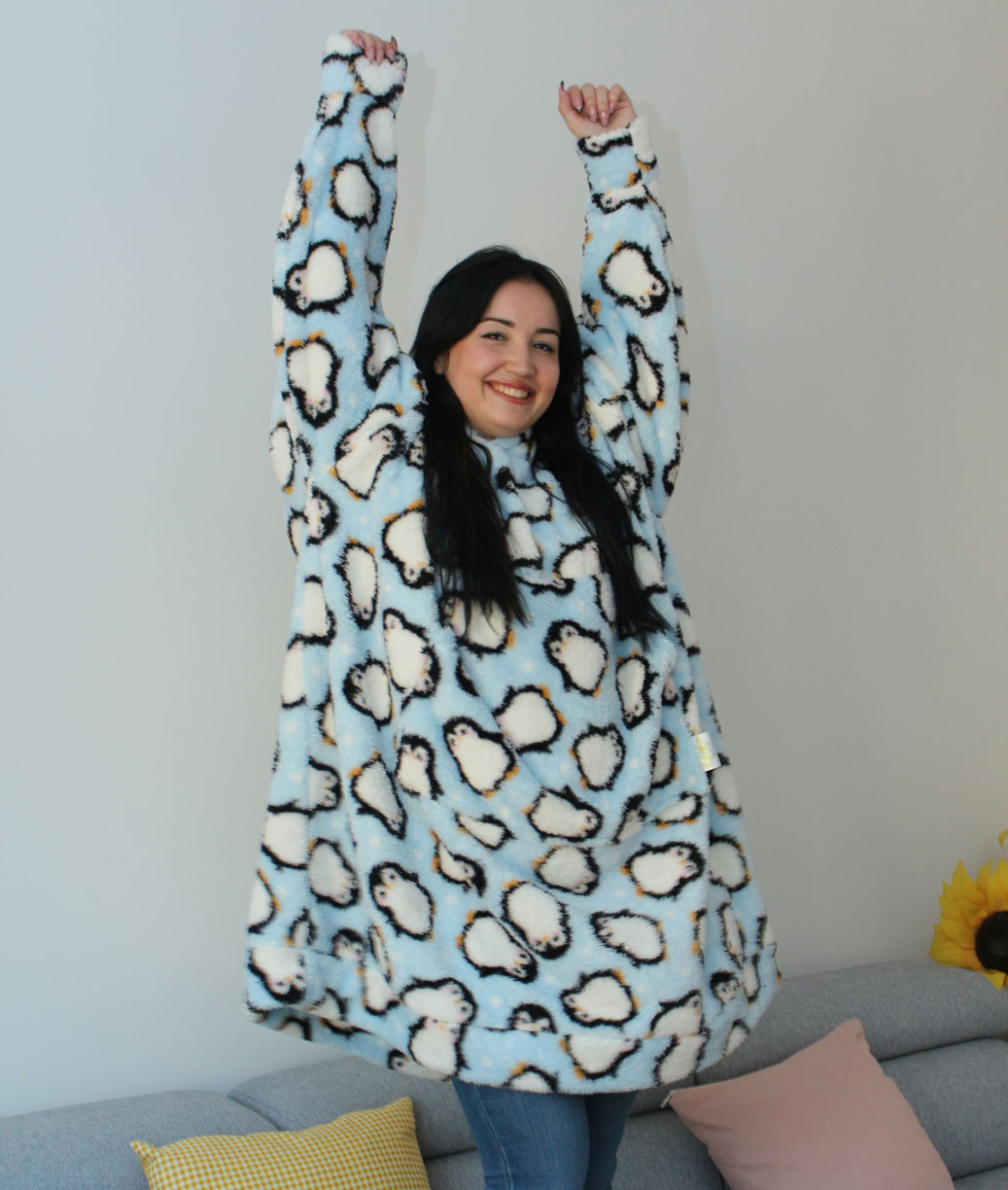 Pingvinčići uz koje vam nikada neće biti hladno. Čupkavo mekano duks ćebe sa dezenom pingvinčića je stvoreno za hladne zimske večeri koje provodite uz omiljenu knjigu, seriju ili film. Veće od najvećeg duksa, tako da odgovara većini odraslih osoba, savršeno za sve smrzlice.